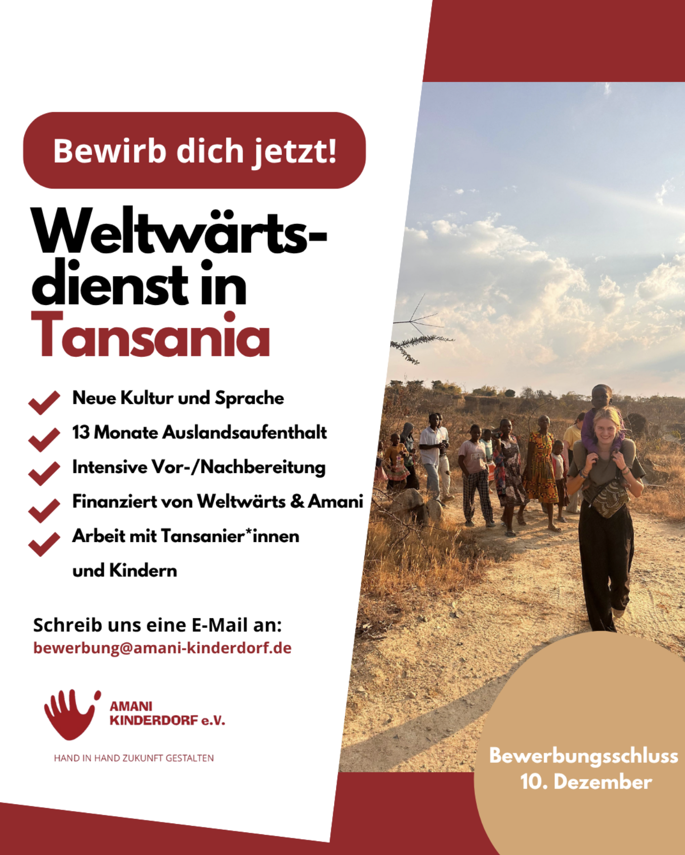 Gerne gibt aber auch Ulrich Siepe, der den Freiwilligendienst bei Amani-Kinderdorf koordiniert, Auskunft. Er ist unter ulrich.siepe@amani-kinderdorf.de und 0173 534 0961 erreichbar. Außerdem könnt ihr euch über Instagram und Facebook informieren oder uns Fragen stellen.