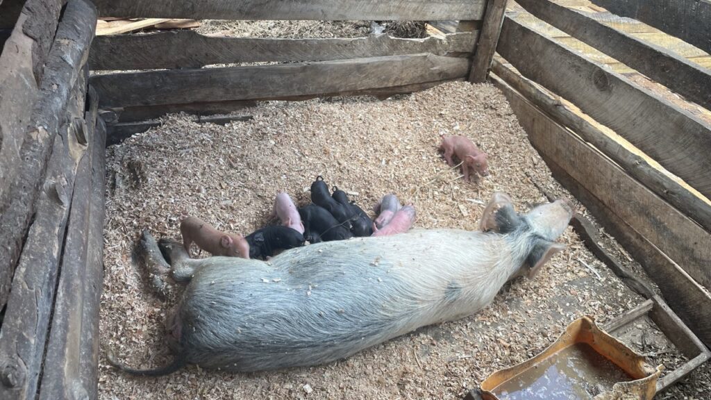Eine Sau hat 11 Ferkel zur Welt gebracht. Das finden die Kinder natürlich spannend.